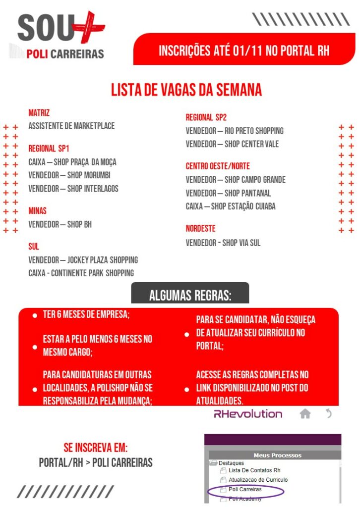 Acompanhe as oportunidades da semana do programa de recrutamento interno/POLI CARREIRAS, para o seu desenvolvimento e crescimento dentro da empresa.