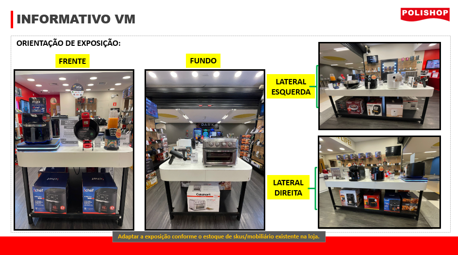 Objetivo: FOCO mesa gourmet com AirFryer, com destaque combo – Vision Max + Panela home Family size, e Power Nutri (produto verão),  Pistola de Massagem, Churrasqueira Polishop Steakhouse Grill e as demais Airfryers (Allspace, High Connect, Airfryer Xiaomi e Vision Max) conforme slide orientativo na próxima página.