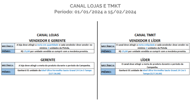 Recompensa:  Prêmio de 1,5% sobre a venda dos produtos elegíveis;