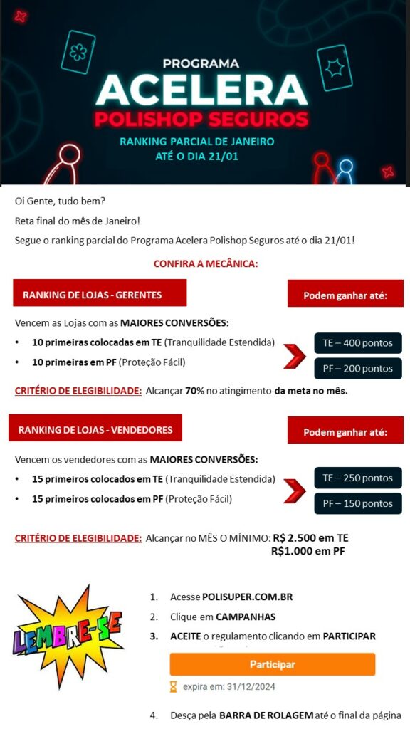 Programa Acelera Polishop Seguros Mês de Dezembro – Ranking Parcial até o dia 21/01/24.