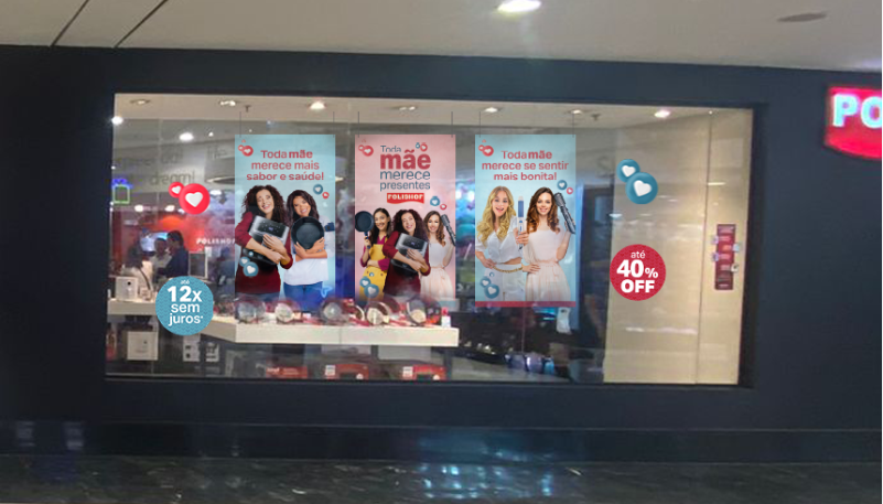 Os banners deverão ser instalados centralizados na vitrine e em suas laterais um adesivo de coração e outro com a condição comercial (conforme imagens acima).