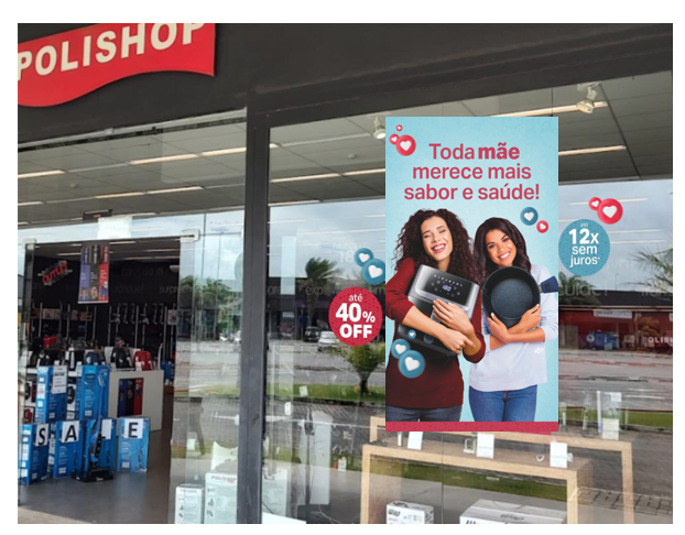 Todos os adesivos de vitrine (coração rosa, coração azul, 12x sem juros e até 40% OFF) serão eletrostático para fácil aplicação nas laterais dos banners.