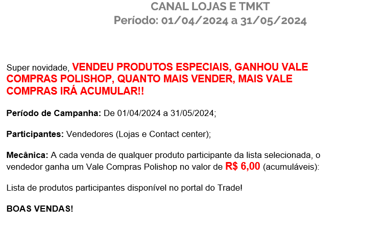 Vale ressaltar que as lojas devem utilizar R$60,00 de verba por campanha ok?!