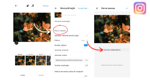 - Na etapa de finalização da postagem, toque no ícone “Marcar Pessoas”;