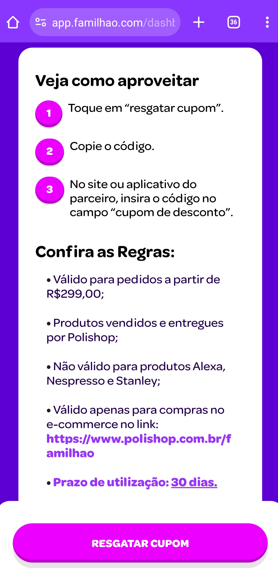 Para conhecimento de todos, a utilização do crédito do Familhão só pode ser realizada através do site, caso algum cliente questione, informe o passo a passo abaixo: