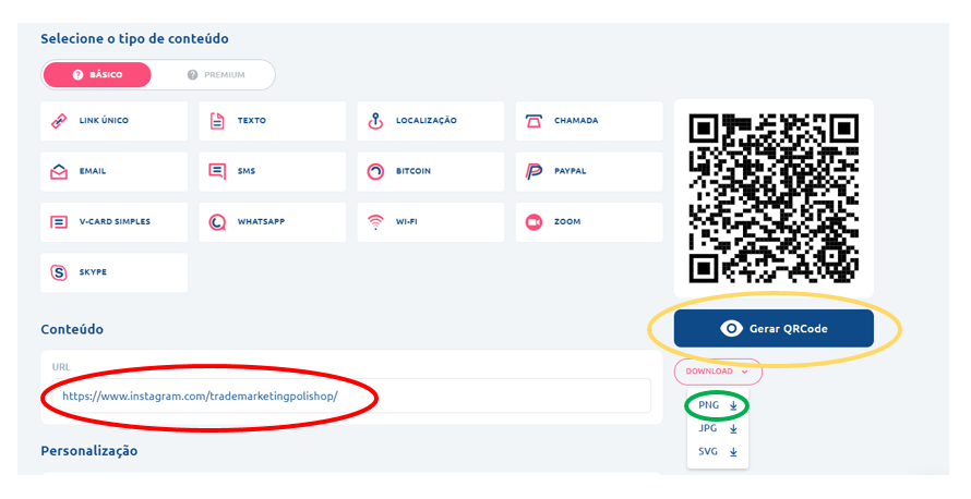 OBS: a ordem do passo a passo está descrito em cores. Primeiro, colar o link (vermelho). Segundo, clicar em “gerar QR Code” (amarelo). Terceiro, clicar em dowload e depois “PNG” para baixar (verde):