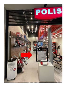 O Xiaomi Robô Aspirador Inteligente Mop 2 Lite deve ser exposto sobre um cubo na entrada da loja, com a sua embalagem na parte de trás do produto, conforme imagem.
