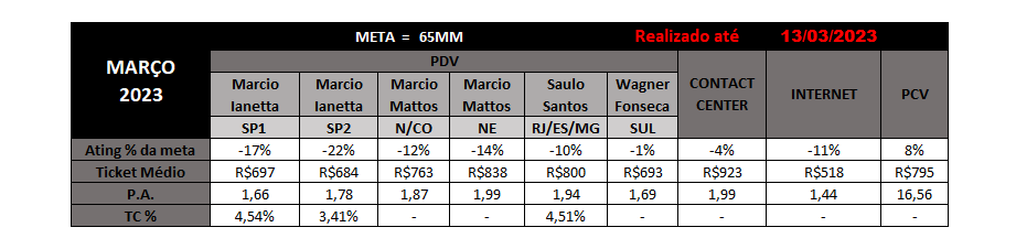 Precisamos acelerar um pouco mais o ritmo de vendas, afinal a Semana do Consumidor chegou, aproveitem a oportunidade para oferecer nossas soluções aos clientes.
