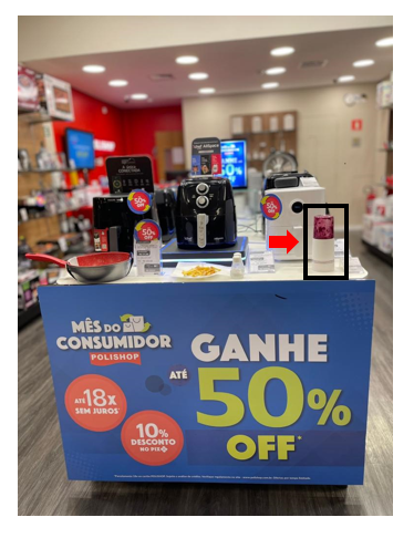 O wobbler deve ser exposto na parte traseira do monitor do caixa principal da loja, conforme imagem abaixo: