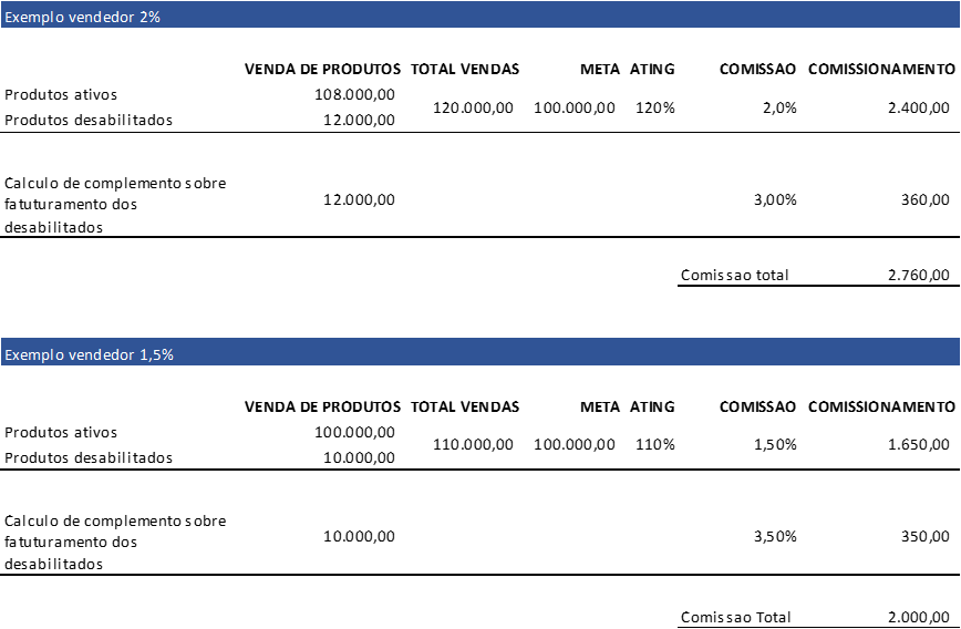 A regra também vale para os vendedores 1,5%, no entanto, nestes casos, sobre o faturamento dos produtos desabilitados será calculado um complemento de 3,5%, para assim atingirmos o comissionamento de 5% previsto no programa.