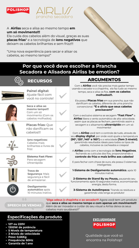 É um produto inovador e exclusivo da Polishop: A Airliss é uma Prancha que seca e alisa os cabelos sem danificar os fios e proporciona um brilho e maciez únicos!!!
