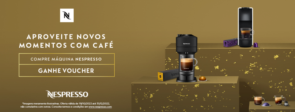 A partir de hoje 19/10/2022 a 31/12/2022 o cliente que adquirir uma máquina de café Nespresso do sistema original ganhará um voucher virtual no valor de R$ 50,00 ou máquina de café sistema Vertuo ganhará um voucher no valor de R$ 150,00.