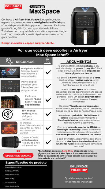 No dia 19/08, teremos um super lançamento, a Airfryer Max Space Ichef, enquanto estamos preparando o Pack completo de lançamento, saímos na frente com a primeira entrega, o nosso One Page de Vendas sobre o produto já está pronto!!!
